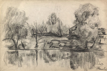 Village pond 1933 on paper, charcoal 14.17/21.26 in (36.00/54.00 cm)