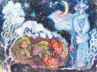 Summer, fairy tale figures and the snow white on paper, mixed media 29.72/39.76 in (75.50/101.00 cm)