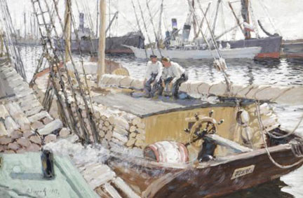 Sailors resting in the harbor 1915 board, gouache 12.30/18.11 in (31.25/46.00 cm)